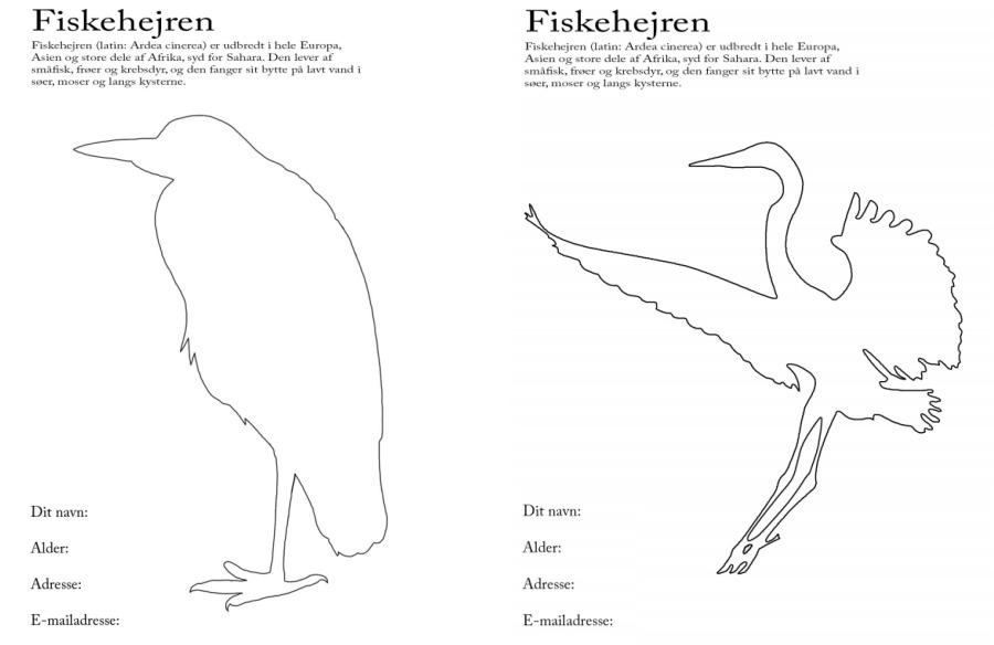 Nederst ses de to tegninger. Klik på hvert af de to link herunder for at hente tegningerne, så du kan gå i gang med at male din egen fiskehejre.