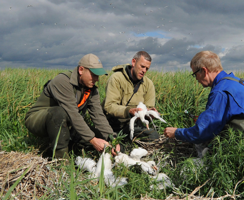 På højre ben har de unge skestorke desuden fået en klassisk ring af letmetal, hvorpå Zoologisk Museums adresse og et løbenummer står.