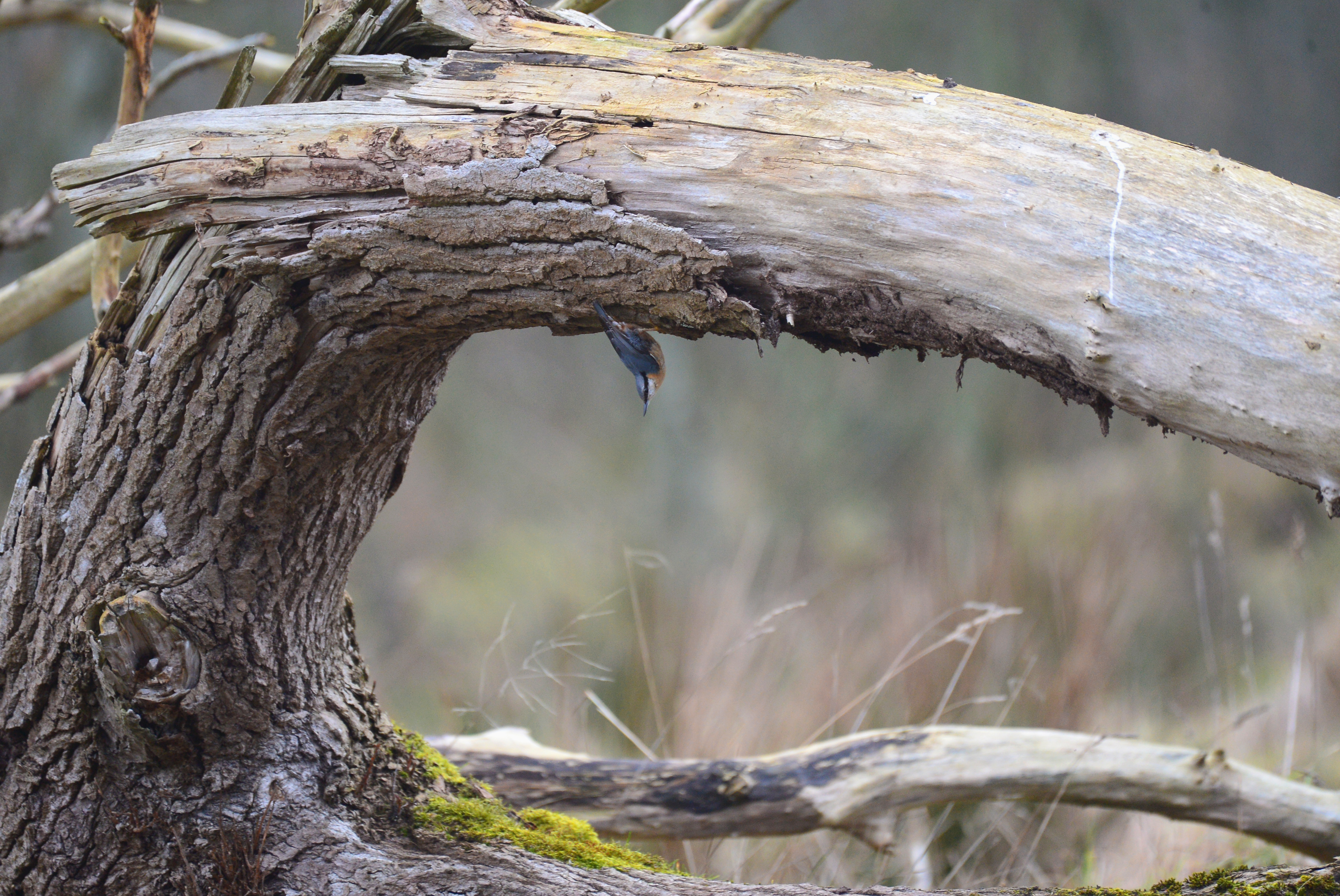 Spætmejse med hovedet ned ad på en gammel stamme. Foto: Jan Skriver.