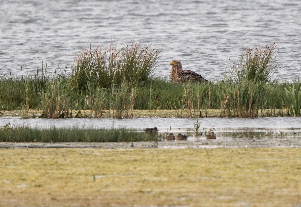 Filsøs Havørne-familie, bestående af det ynglende par og to unger fra i år, har langt om længe fattet, at det er på tide at vise sig lidt frem for publikum. En af årets unger sad den første times tid på den sædvanlige sten på Povls Pold, og jeg tror, alle nåede at nyde synet af den. Den anden unge dukkede pludselig op, og de fløj sammen til overnatning ved Søndersø. Da jeg fik nærstuderet billederne hjemme ved computeren, kunne jeg se, at den anden unge Havørn sad i det høje græs til venstre for Povls Pold. Kun lige hovedet var synlig. Det kan ses på det første billede.